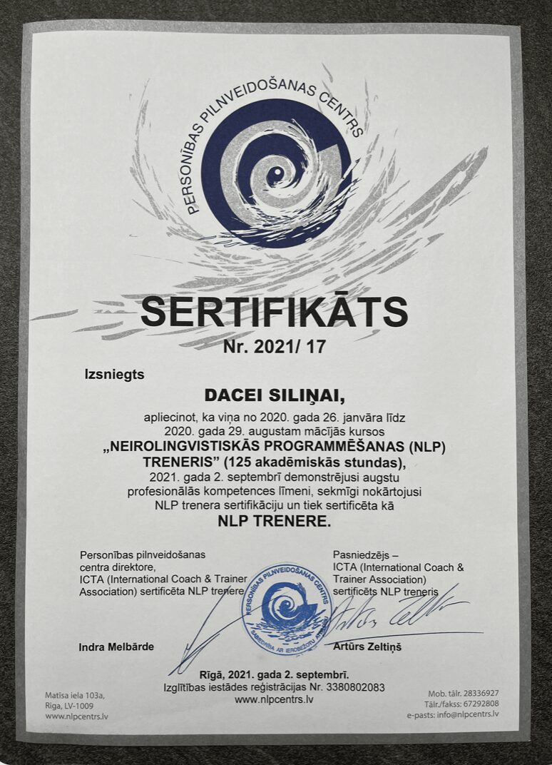 Es esmu Dace Siliņa, vācu valodas pasniedzēja, sertificēts koučs, NLP (neirolingvistiskā programmēšana) un transformatīvās elpošanas trenere.